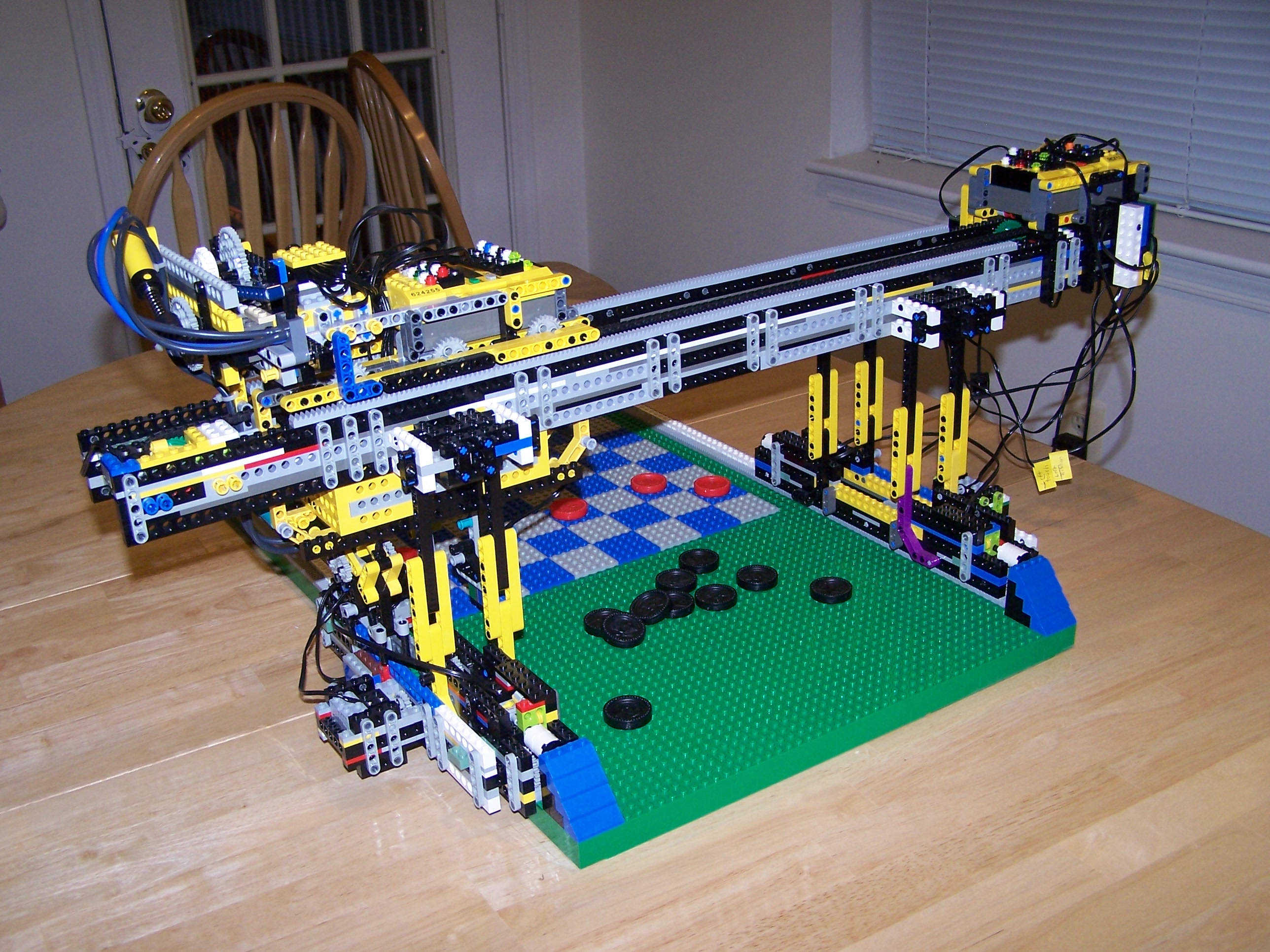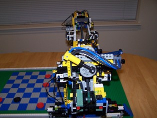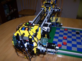 Well here it is the CheckerBot RCX. I have been working on this on and off for about 6 months maybe little more. This is the second robot that I have build by my own design. After building the eight legged walker (aka Ernie) I wanted to do something that was challenging and would take a bit of work. Personally I think its pretty amazing what you can do with the RCX. The LEGO Mindstorms developers and the LEJOS developers need a big pat on the back.