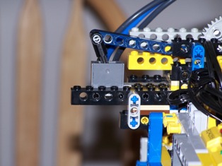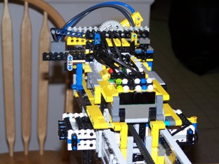 The Slave RCX sits on the end of the frame and is responsible for all navigation functions. Its directly in line with the master RCX to keep communications good. On the frame there are three motors, three rotation sensors and six touch sensors. I am using a passive mux from mindsensors.com and and active muc from them also. the touch sensors are used to synchronize the rotation sensors. Each truck on the frame has a rotation sensor on the side and a touch sensor on each end. The two touch sensors are connected together and are then connected to one of the ports on the passive mux. Under the RCX is the motor and the other rotation sensor for the boom. I’m using Lego link chain to move the cab with the third motor. If you ever get a chance get some of the chain its really handy. The rotation sensors on the right truck and the boom are attached to the active mux. The active mux is quite handy it allows you to attach up to three active sensors to it. I wrote a class for the mux in java ill be posting it on the site shortly. The only problem I have with this setup is that the trucks tend to drift some even with the motors set to off. This is not really a problem except the right side rotation sensor will not register this if the active mux is switched to the port for the rotation sensor for the boom.