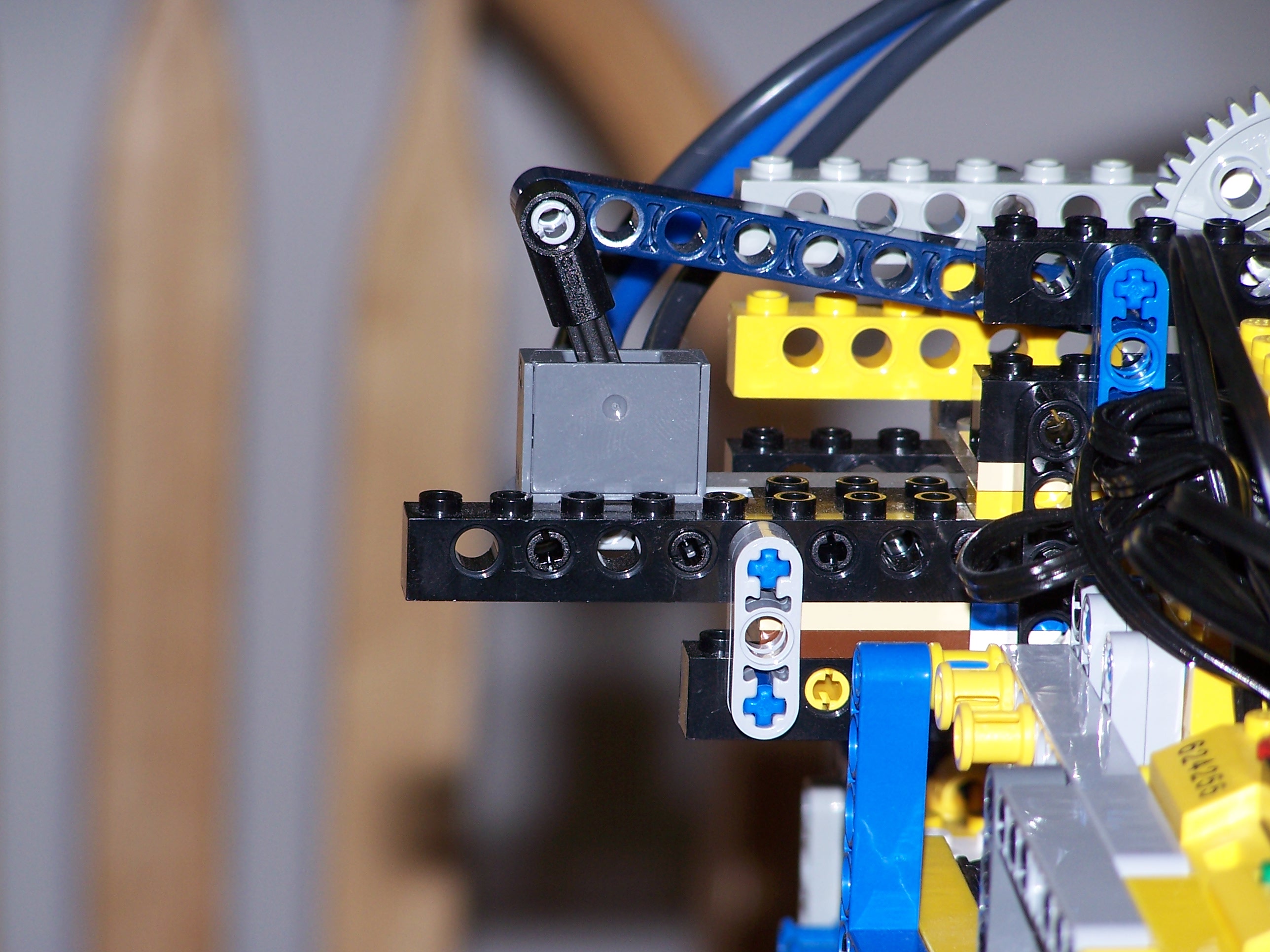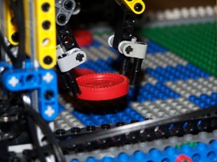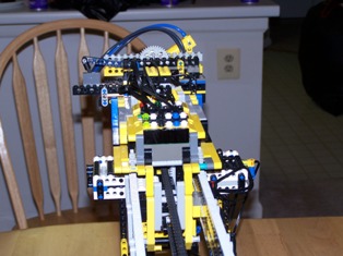 Two RCXs are used in this robot they operate in a master slave configuration. The master is a rides in cab above the gripper arm and the light sensor arm. The slave sits on the end of the boom and handles all navigation tasks. I used the lejos replacement firmware for this project and I found that it works very well.