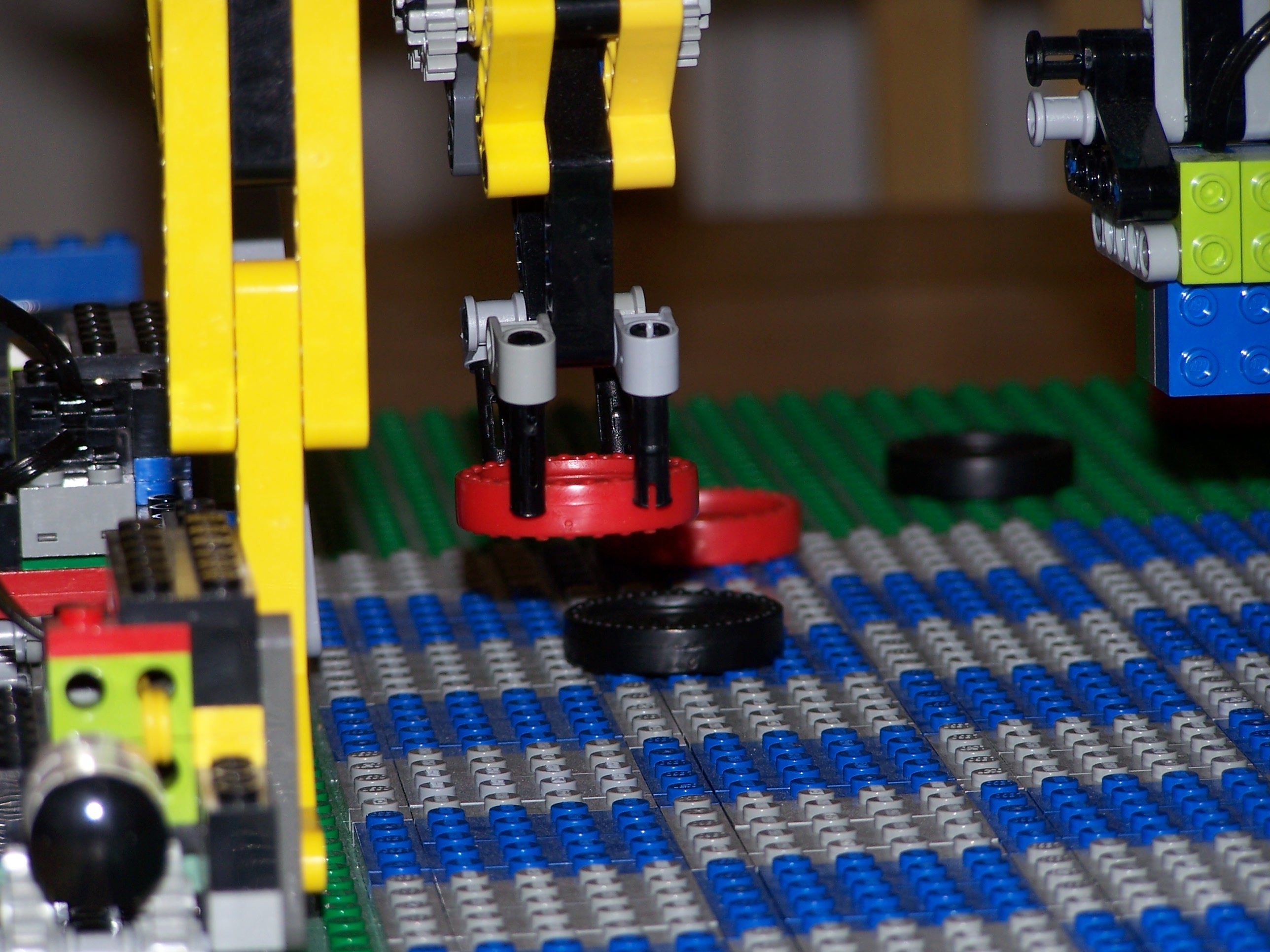 The Master rides on the cab in a basket facing the slave robot. I came up with the idea of building baskets for the RCX to lay in about a year ago. This eliminates the need to snap the brick in to place. In side the belly of the cab are two motors and two rotation sensors . Each pair of these operates as a servo motor and is used to raise and lower the gripper and the light sensor. On the back of the cab sits a air compressor for opening and closing the gripper. I went though several designs for both the compressor and the gripper. The current compressor uses a Lego hand pump and the motor is on a 25:1 ratio. Depending on the direction that the motor is running an air valve changes directions. I use a clutch on the valve gears to prevent the motor from stalling. the gripper is loosely based on the gripper on the 8436 truck. Both arms on the cab are lifted by the two motors and monitored by the rotation sensors. When the program first starts they are both lifted and when they are moving anymore for more than a half second then the motors turn off.